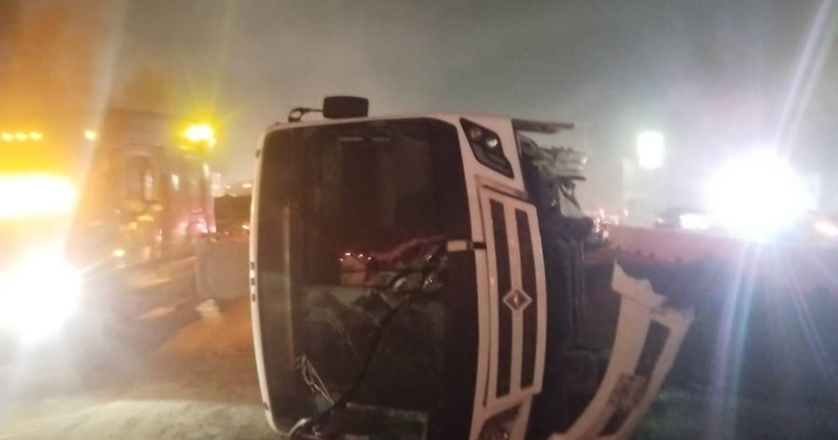 Protección Civil del estado informó que el percance vial se debió a que la unidad chocó contra el muro de contención y terminó volcada.
