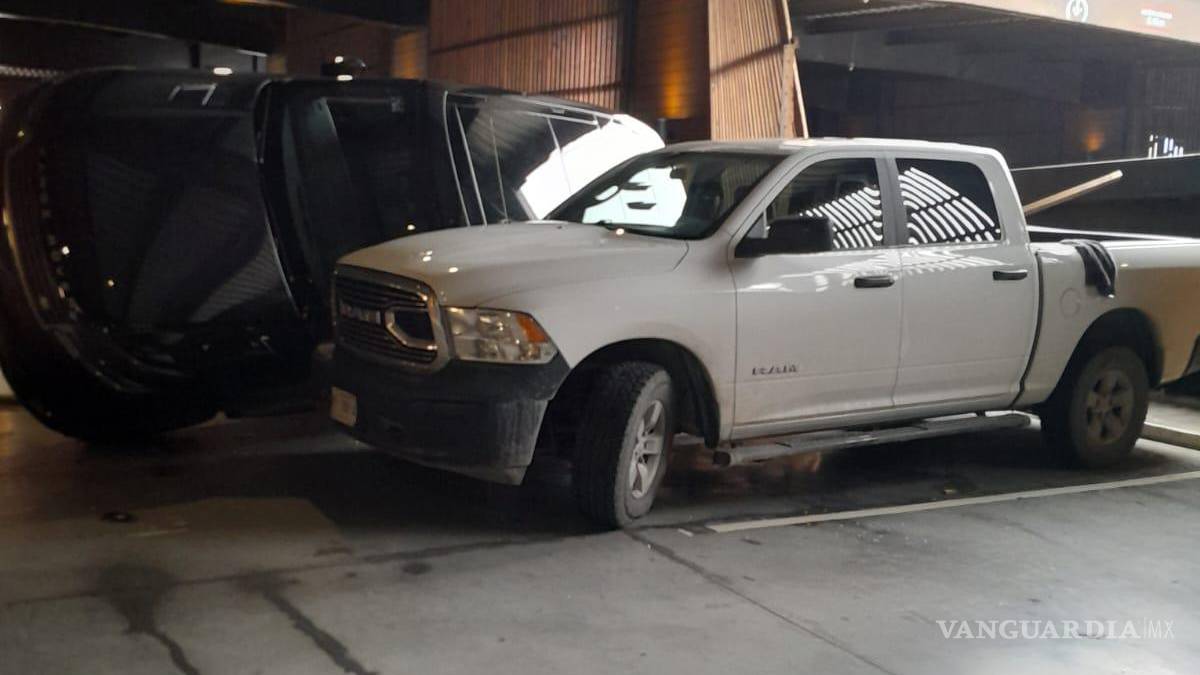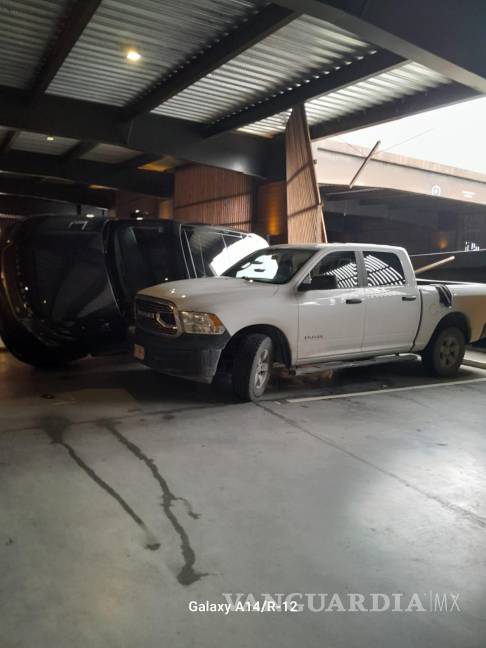 Camioneta sin frenos cae sobre otra en estacionamiento de plaza comercial, en Monterrey