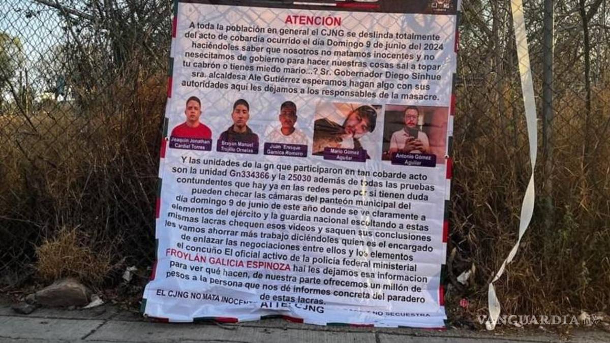 También aparecieron en la ciudad cartulinas firmadas por un supuesto nuevo cártel que se atribuye el asesinato de las cuatro mujeres y dos pequeños el domingo en la colonia Industrial, y que asegura que llega para hacer una “limpia” contra el CJNG.