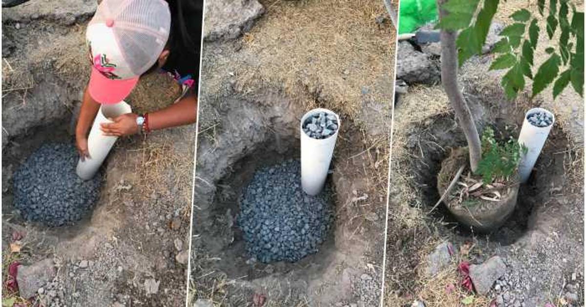 A la hora de regar, en lugar de dirigir el agua al árbol u otra parte, se coloca sobre el tubo y “el agua va bajando por la grava y las raíces no van a levantar la banqueta ni la calle”, explica Jericó.