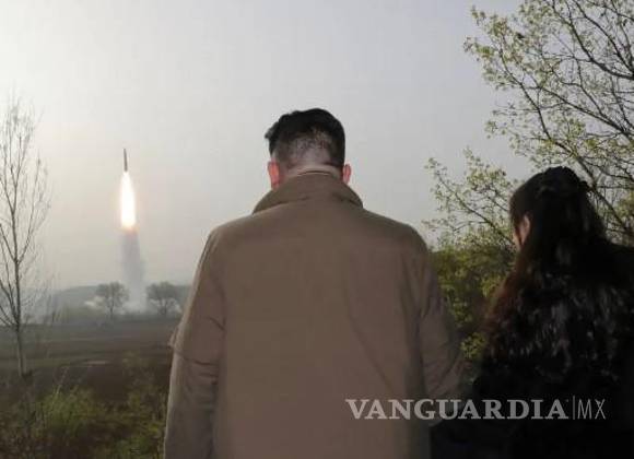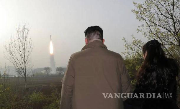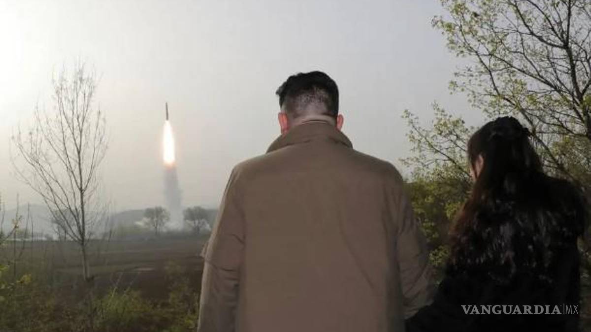 Los medios estatales de Corea del Norte publicaron fotos del misil despegando desde un vehículo de lanzamiento en un sitio de prueba dentro de un bosque mientras Kim observaba desde un puesto de observación junto con oficiales militares y su hija.