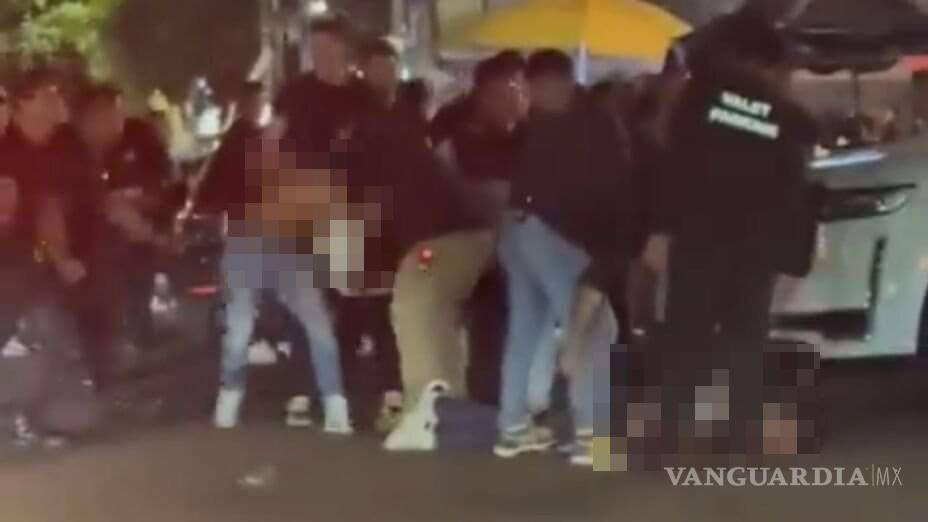 Mientras que uno segundo es fuertemente golpeado por varios sujetos de playera negra, quienes aparentemente son trabajadores del local.