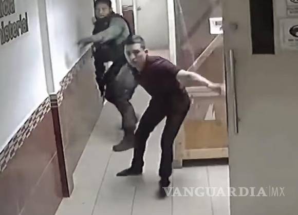 A las 18:05 muestra el vídeo, arriban a la entrada del edificio un auto blanco del que descienden cuatro hombres armados vestidos con ropa táctica y chalecos blindados.