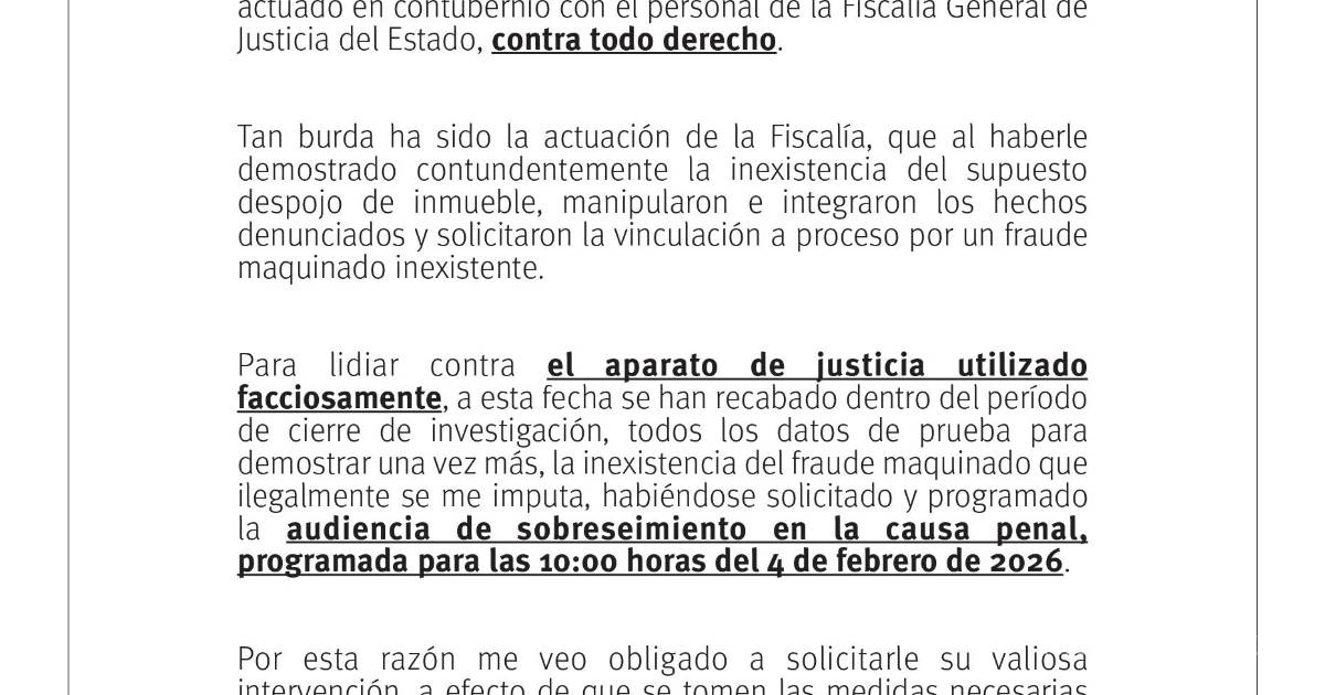 Para lidiar contra el aparato de justicia utilizado facciosamente, a esta fecha se han recabado dentro del período de cierre de investigación, todos los datos de prueba para demostrar una vez más, la inexistencia del fraude maquinado que ilegalmente se me imputa, habiéndose solicitado y programado la audiencia de sobreseimiento en la causa penal, programada para las 10:00 horas del 4 de febrero de 2026.