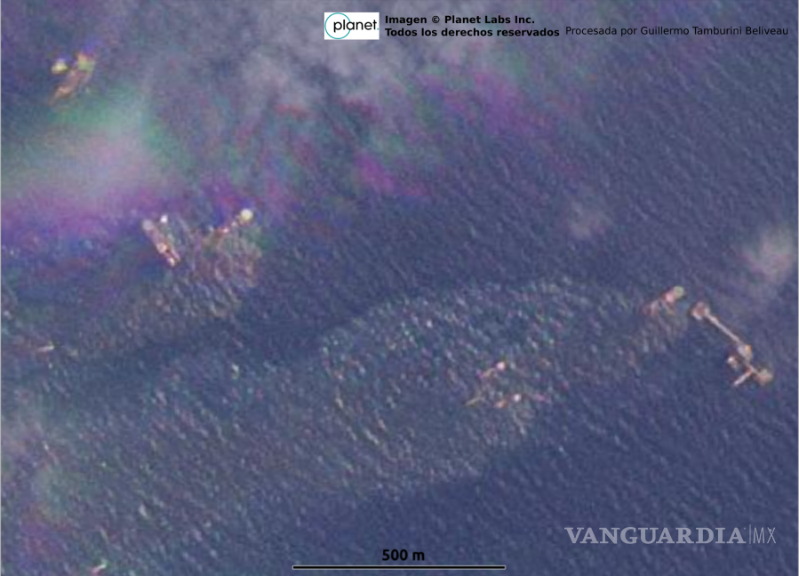 Las imágenes procesadas por el geógrafo Guillermo Tamburini, demuestran el registro del derrame de crudo en la plataforma Balam, con las cuales pudieron deducir que el derrame inicio el 4 de julio.