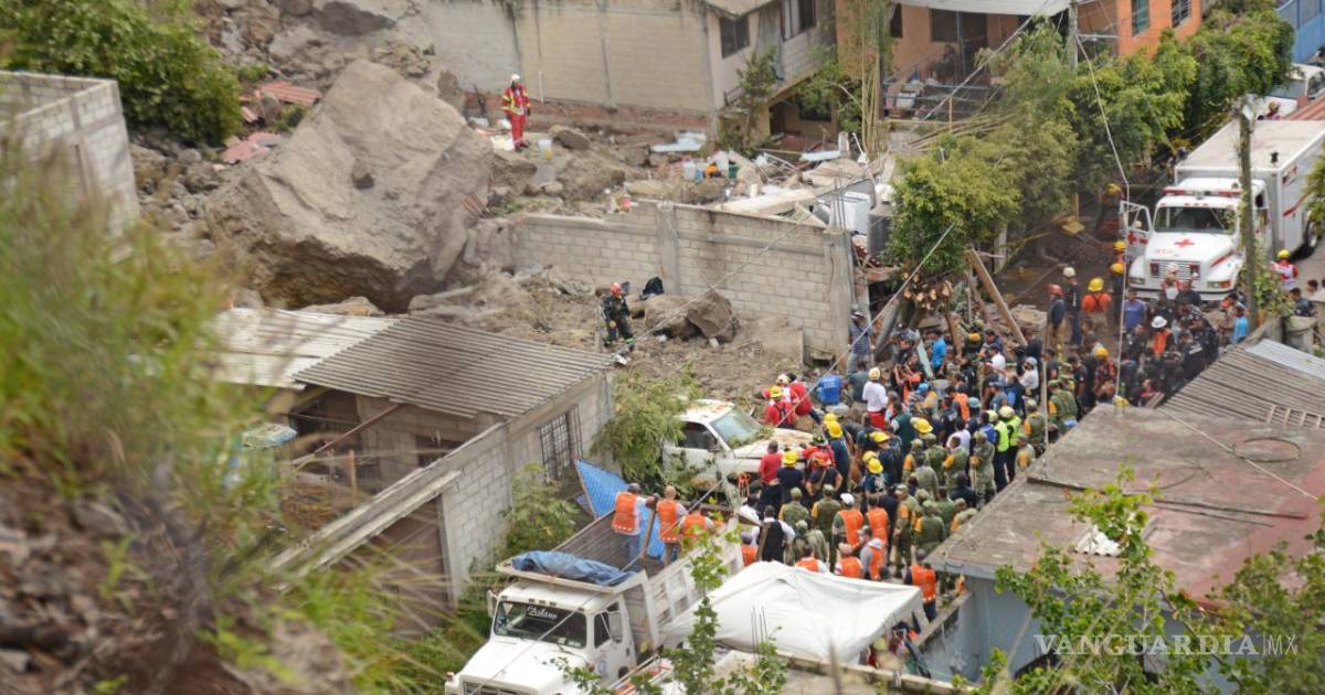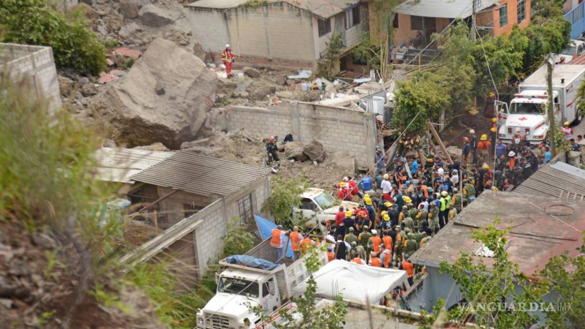 Elementos de la Secretaría de la Defensa Nacional (Sedena) acudieron con palas, picos y binomios caninos para localizar a las personas que quedaron enterradas.