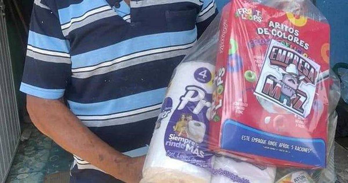 En la imagen se ve a un hombre de la tercera edad posando con los bienes que le fueron entregados a nombre del “Mayo” Zambada que están en una bolsa de plástico transparente que contiene un paquete de papel higiénico, latas de atún, cajas de leche y cereal.