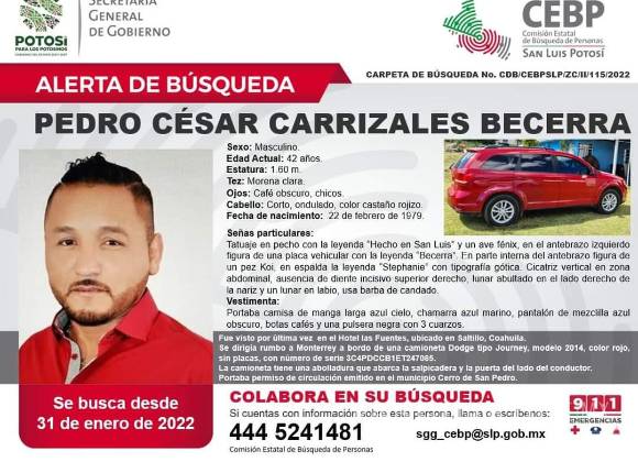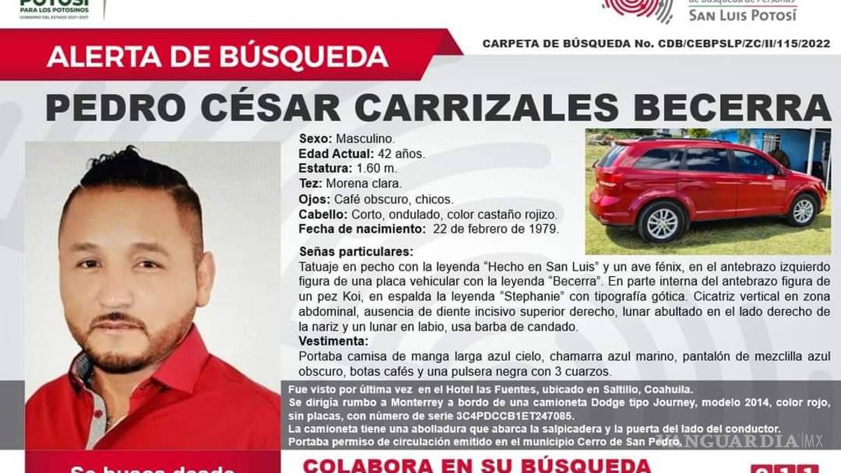 Según una ficha difundida en la página de Facebook de la Comisión Estatal de Búsqueda de Personas, el exlegislador fue visto por última vez en el hotel Las Fuentes, ubicado en Saltillo, Coahuila y se dirigía a Monterrey a bordo de una camioneta Dodge Journey 2014, color rojo.