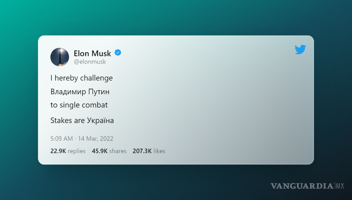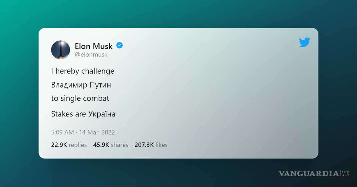 “Por la presente desafío a Vladímir Putin a un duelo. Lo que está en juego es Ucrania”, sentenció Elon Musk en un breve mensaje en el que intercaló la escritura cirílica, luego, concluyó con un “¿Aceptas el enfrentamiento?” y mencionó la cuenta oficial del Kremlin.