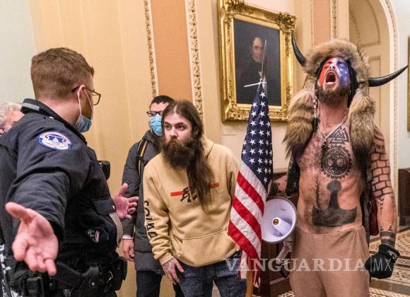 El “Chamán” se ve en las imágenes siendo escoltado por dos oficiales de la Policía del Capitolio mientras deambulan por los pasillos del Congreso, tratando de encontrar una puerta abierta que conduzca a la cámara del Senado.