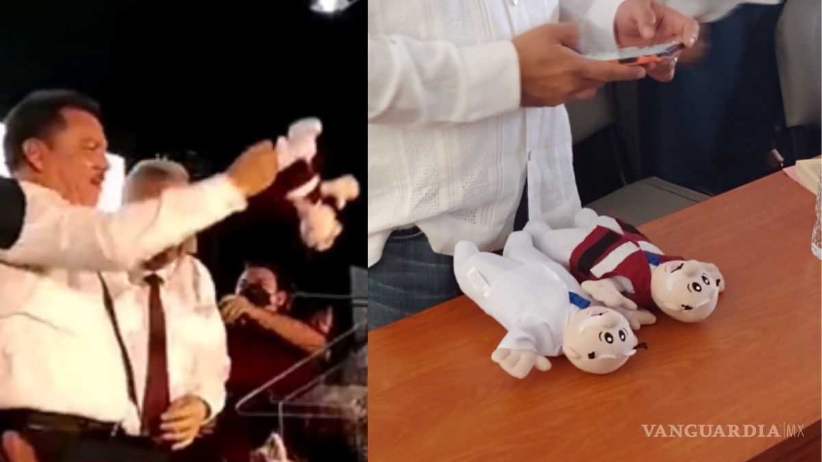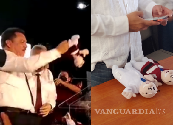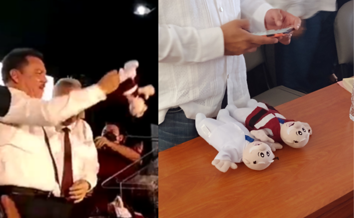 El regalo se dio al cierre del evento, cuando simpatizantes del movimiento comenzarón a lanzar al icónico muñeco de las Farmacias Similares.