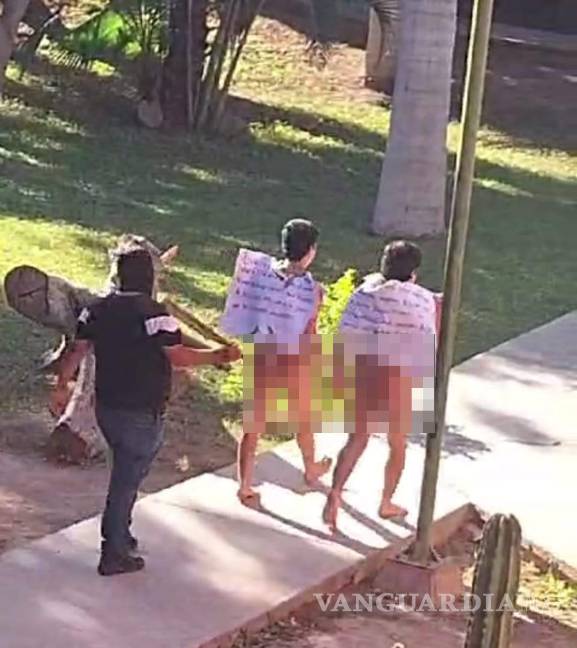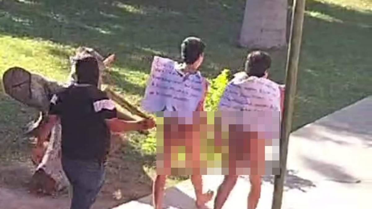 A continuación, los individuos no identificados colgaron a los jóvenes cartulinas con mensajes en los cuales se les atribuyó vender vapeadores, se les denominó “chapulines” (vendedores de droga y/o rateros) y se advirtió que ya tienen ubicados a otras personas que expenden estupefacientes, así como cigarrillos electrónicos.