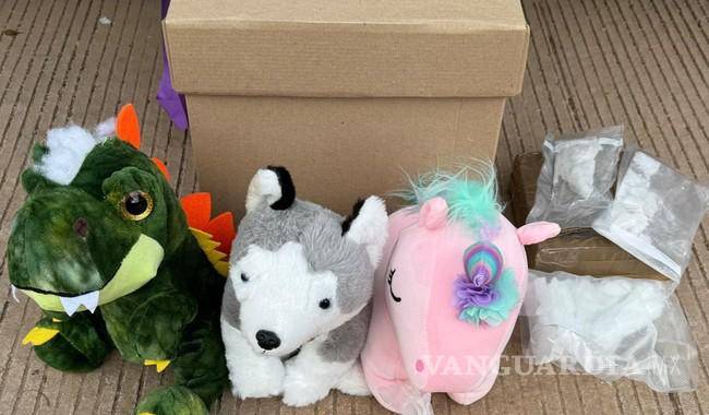 En otra caja, con destino a Mexicali (Baja California), se encontraron tres figuras de peluche: un lobo, un unicornio y un dinosaurio.