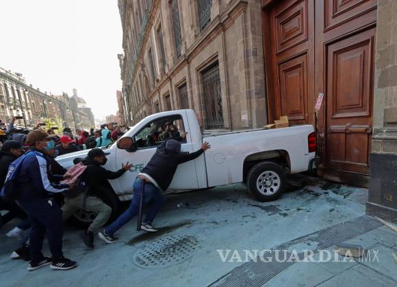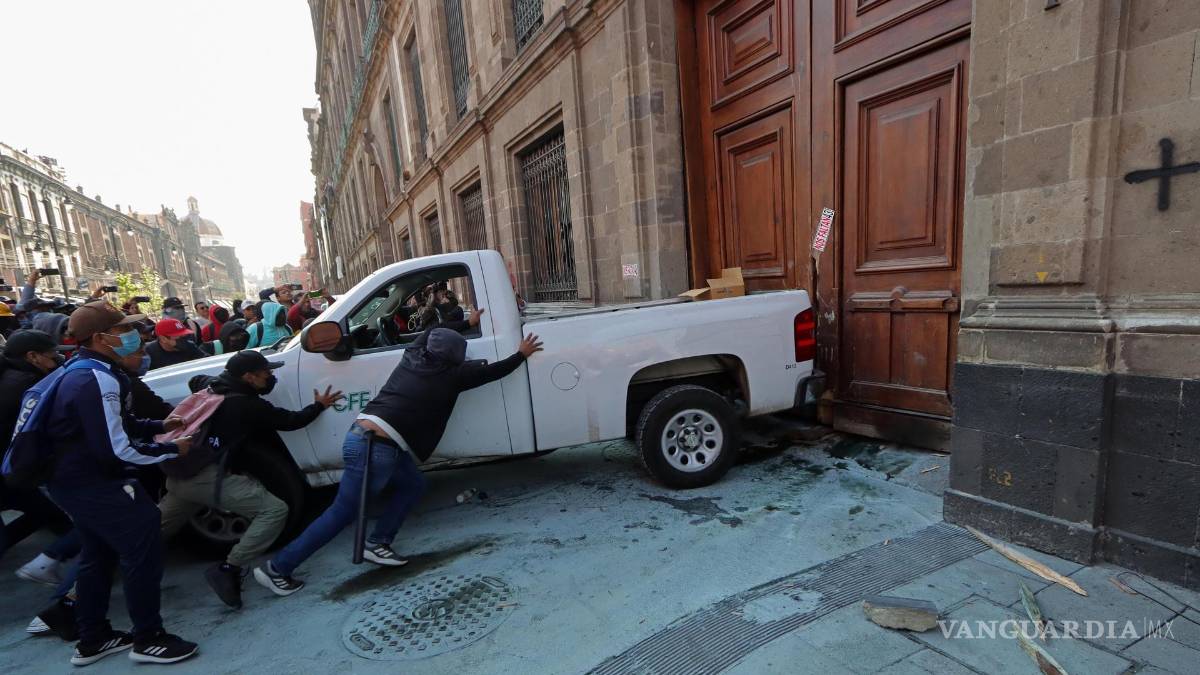 Este miércoles, un grupo de manifestantes identificados como estudiantes de Ayotzinapa derribaron con ayuda de un vehículo oficial de la Comisión Federal de Electricidad (CFE) una de las puertas de Palacio Nacional, mientras el mandatario aún se encontraba en su conferencia mañanera.