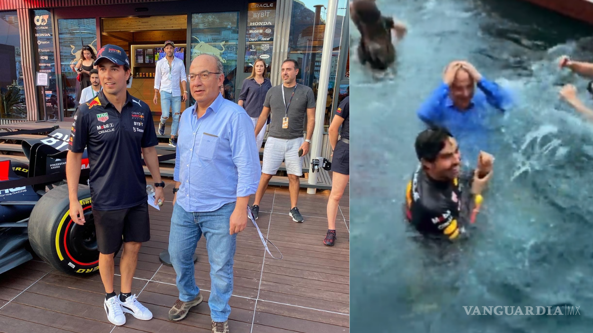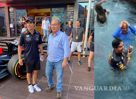 Sobre un padock de la Red Bull, construido sobre el mar y donde instalaron una alberca, celebró el equipo mexicano el triunfo de Checo, uniéndoseles Calderón al saltar a la piscina del brazo del piloto.