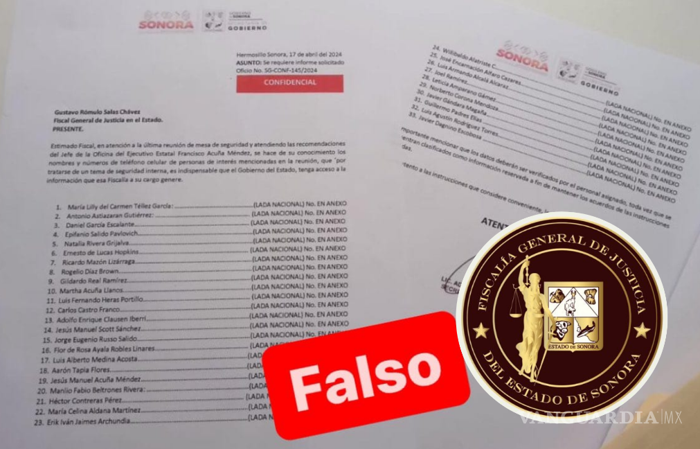 La Fiscalía General de Justicia del Estado de Sonora (FGJE) ha desmentido la veracidad de un documento que se ha difundido en medios de comunicación. Este supuesto documento, atribuido al Secretario de Gobierno y dirigido al Fiscal de Sonora, solicitaba información sobre diversas personas de interés, incluyendo candidatos a cargos de elección popular, políticos y periodistas.