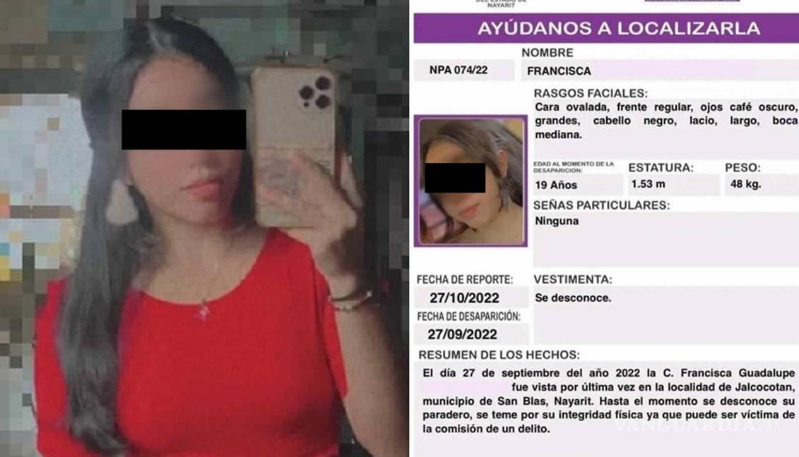 En comunicado oficial emitido la noche de este lunes informó que el sábado 29 de octubre fue localizado un cuerpo sin vida dentro del predio conocido como La Cebadilla, en el ejido Jalcocotán, municipio de San Blas, y que luego de los exámenes que exige la ley en estos casos, la dependencia podía “confirmar que dicho cuerpo corresponde al de la joven Francisca “N”, desaparecida el pasado 27 de septiembre” del año en curso.