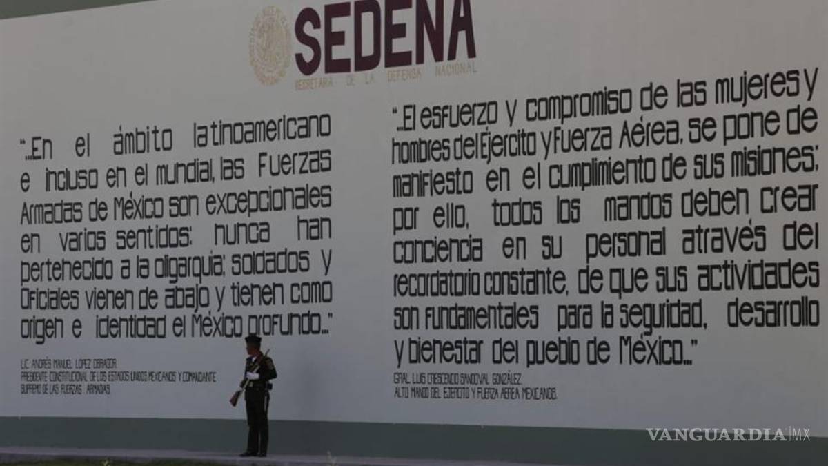 A un lado de la frase del presidente, fue escrita en letras negras una frase del secretario de Defensa, Luis Crescencio Sandoval, que hace alusión a las misiones del Ejército.
