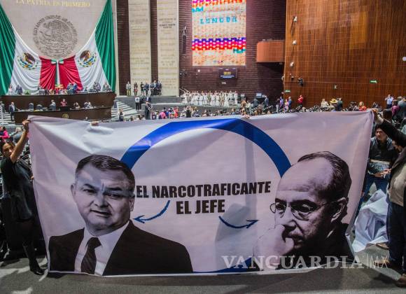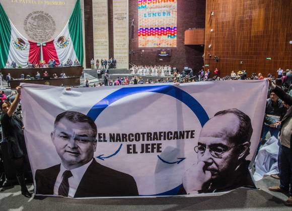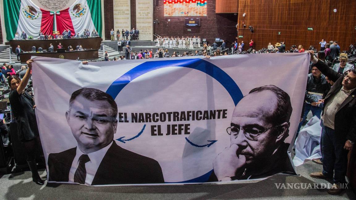 La bancada guinda sacó mantas con las caras del exsecretario de seguridad y Felipe Calderón junto a la leyenda de ‘culpables’