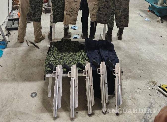 Una quinta acción tuvo lugar en la calle Carmen Ahumada, colonia El Mirador, inmueble en el que aseguraron un taller de hojalatería y pintura, dos vehículos, piezas automotrices, maquinaria de corte y soldadura de lámina, un arma de fuego de uso exclusivo y una bolsa que contenía enervante con características de marihuana, según la FGR