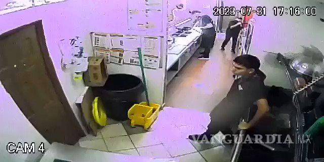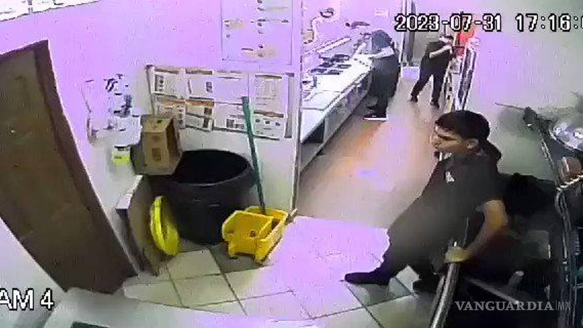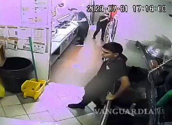 Cámaras de seguridad del establecimiento captaron el momento en que un hombre irrumpe en el área de cocina y propina un puñetazo en la cara a un empleado.
