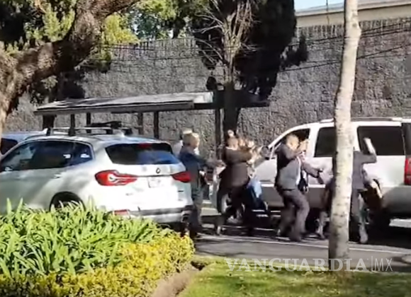 En ese momento aparece un hombre mayor con saco gris, quien trata de detener la pelea y hace que se alejen los escoltas hacia su auto. Sin embargo, se aprecia cómo entre las dos camionetas siguen los manotazos.