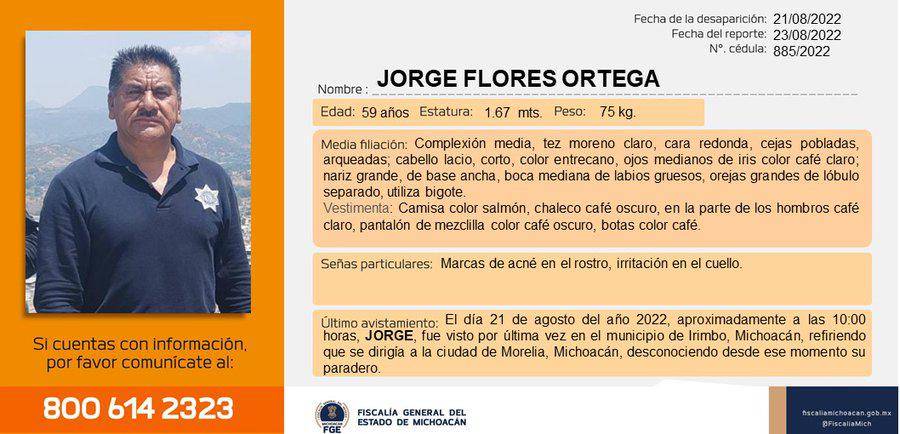 Luego de una semana de su desaparición, el día de hoy, viernes 26 de agosto, fue hallado el cuerpo del director de Seguridad Pública Municipal de Irimo, Michoacán, Jorge Flores Ortega; también se encontró el de una persona que lo acompañaba.