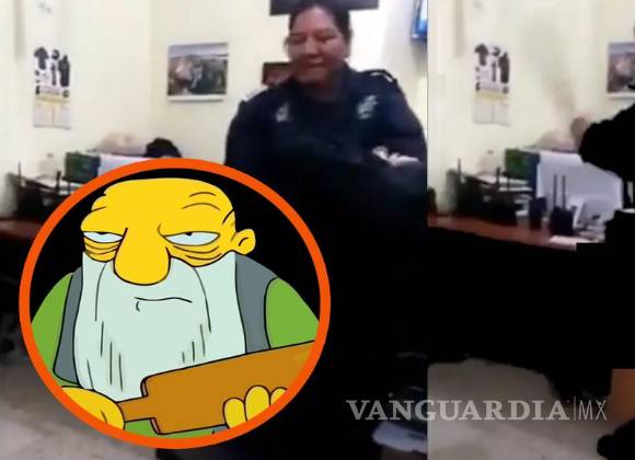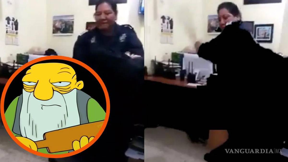 En el video se muestra a un hombre detenido con las manos esposadas en su espalda y los pantalones abajo, mientras está recargada en un escritorio, momento en el cual la oficial lo golpea en el trasero con la tabla.