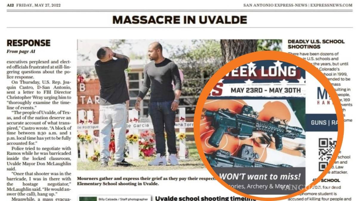 “La colocación de San Antonio Express News es completamente inaceptable. Hace meses coordinamos una serie de anuncios con SA Express sin saber dónde se colocarían. Estamos tan indignados como todos por la decisión que alguien tomó de poner este anuncio en la misma página con las desgarradoras noticias sobre lo que sucedió en Uvalde a principios de esta semana”, expresó en su texto el negocio de armas.