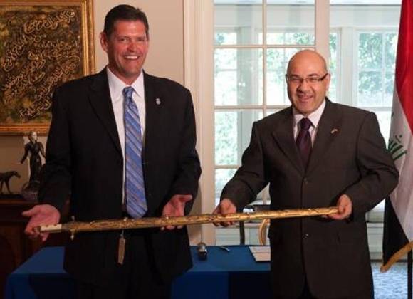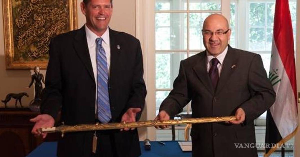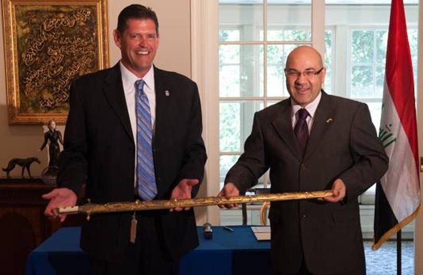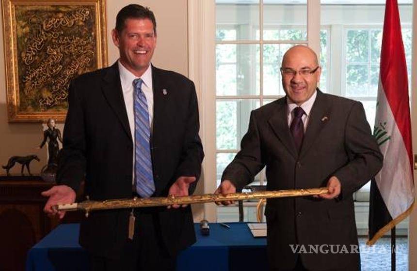 Durante una ceremonia privada, el director asociado de la Oficina de Investigaciones de ICE, James Dinkins, hizo la devolución de la espada, que fue introducida a EU en contrabando por miembros del Ejército estadounidense, al nuevo embajador iraquí ante la Casa Blanca, Lukman Faily.
