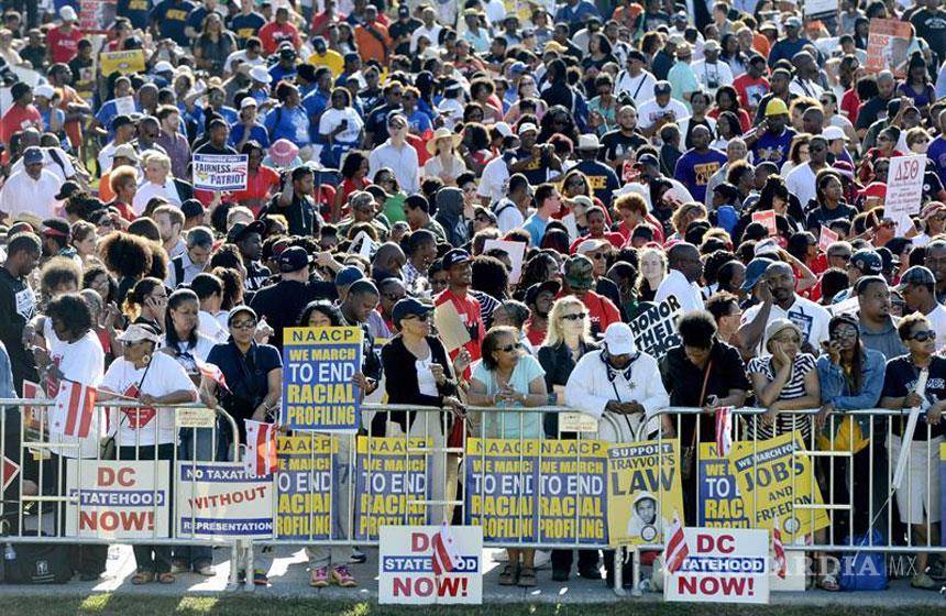 Muchos de los asistentes portaban carteles con la cara del joven Trayvon Martin, un adolescente negro de 17 años que fue asesinado el año pasado en Florida por un vigilante voluntario, George Zimmerman, quien recientemente fue encontrado no culpable de la muerte del joven.