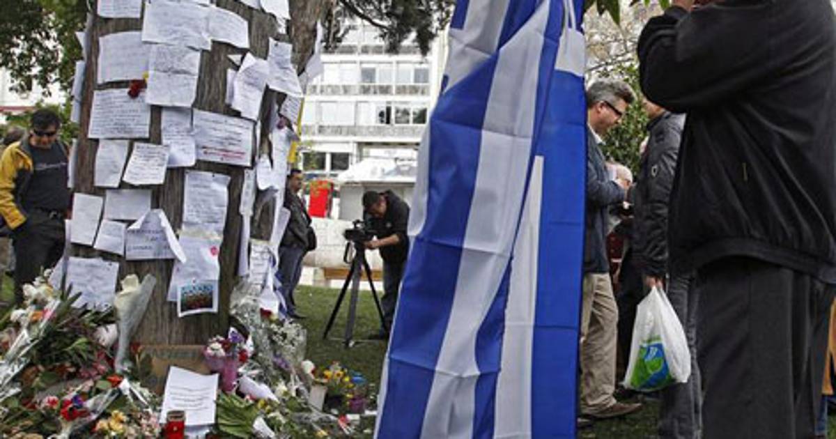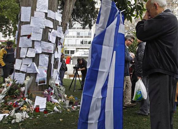 La televisión privada Skai señaló que el hombre dejó una nota en su bolsillo en la que atribuía su decisión de quitarse a la vida a la crisis de deuda, alegando que no quería ser un lastre económico para sus hijos después de que el gobierno recortara su pensión. Aseguraba que el gobierno le había hecho imposible la supervivencia con una pensión a la que contribuyó durante 35 años.