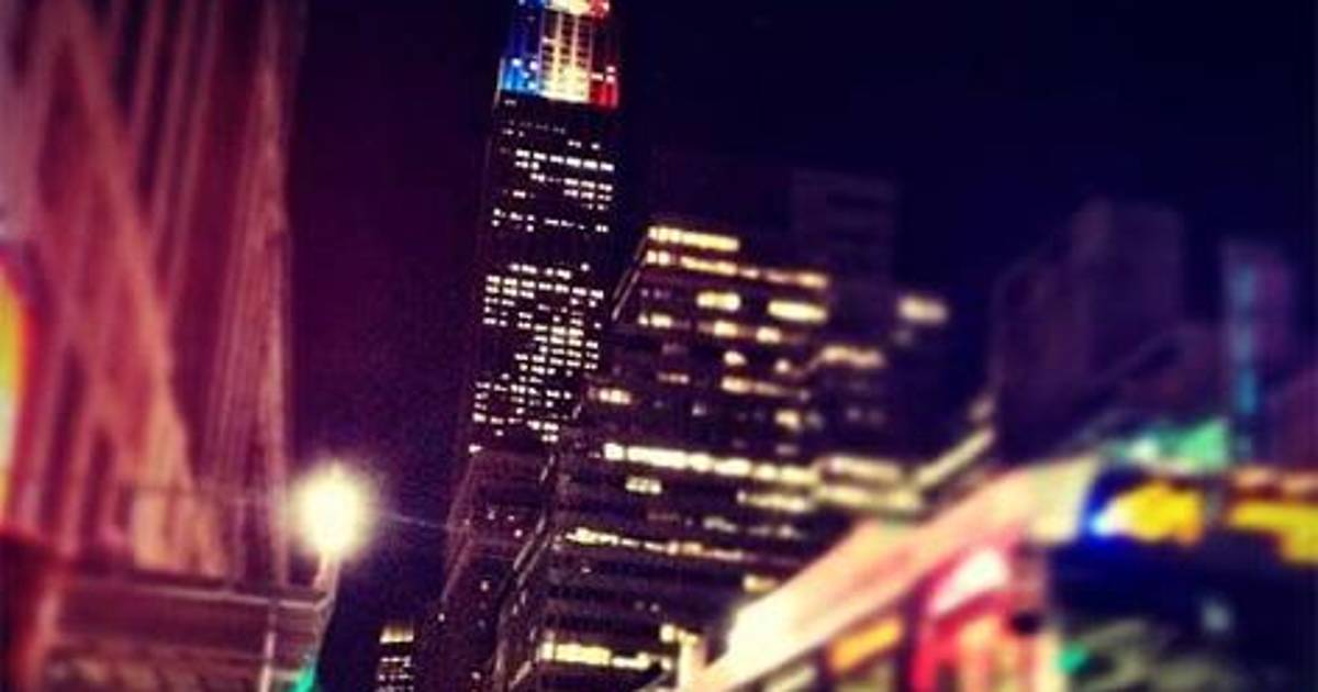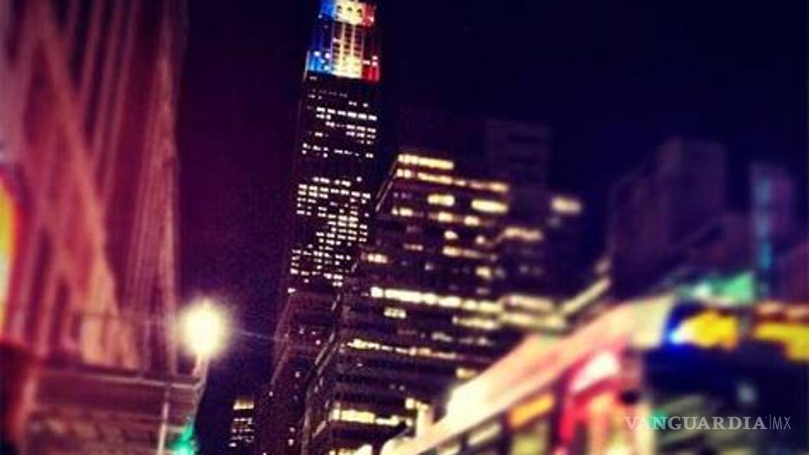 La fachada del rascacielos alumbró la noche con unas franjas verticales en los colores de la bandera estadunidense, el rojo, el azul y el blanco.