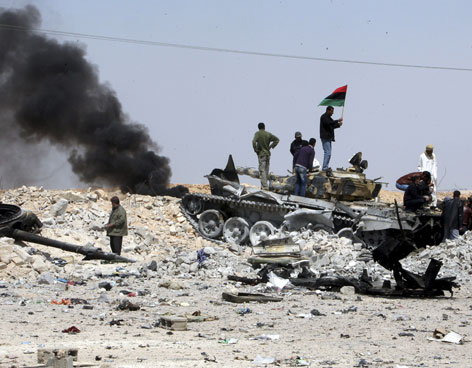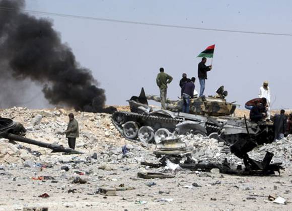 Con disparos al aire, los rebeldes libios celebraron esta mañana en las calles de Ajdabiya la salida de las tropas de Gaddafi de esa ciudad, con respaldo de los ataques aéreos estadounidenses y europeos tras seis días de enfrentamientos.