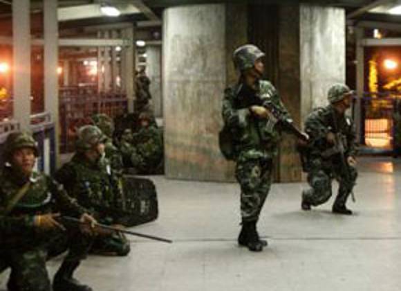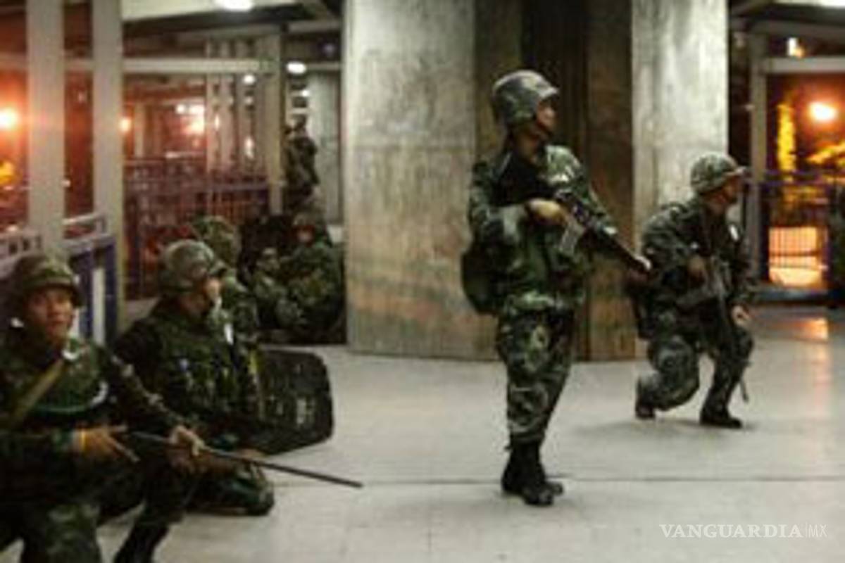 Soldados tailandeses armados con rifles de asalto ocuparon este lunes (tiempo local) el distrito financiero de Bangkok para impedir que lo paralicen los miles de manifestantes antigubermanentales que exigen la disolución del Parlamento.