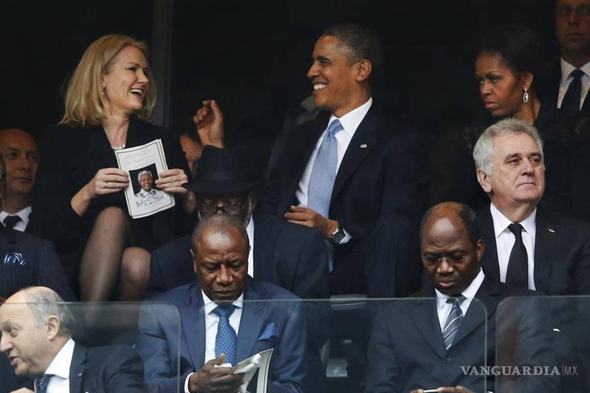 El encuentro ocurrió durante el servicio religioso en homenaje al difunto líder sudafricano Nelson Mandela, en el estadio FNB de Soweto, en Johannesburgo, donde el trío de personajes compartieron lugares.