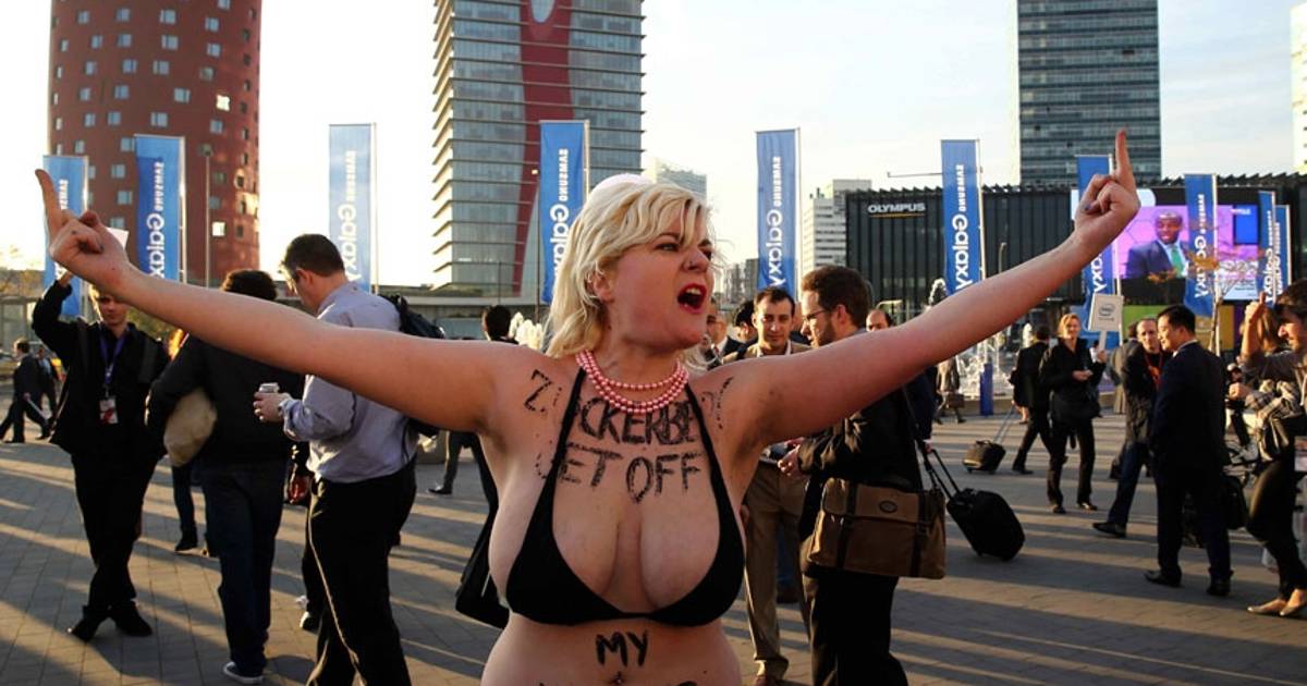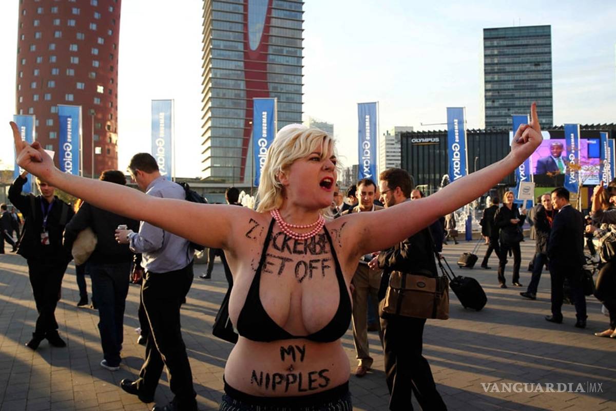 El grupo feminista, conocido por protestar 'a pecho descubierto', llegaron hasta los exteriores del L'Hospitalet portando carteles en los que se podían leer mensajes como: "Facebook. El sexismo es uno de nuestros términos y condiciones", que causó revuelo porque justo en ese momento en el recinto ferial, el fundador y presidente de Facebook, Mark Zuckeberg se encontraba exponiendo.