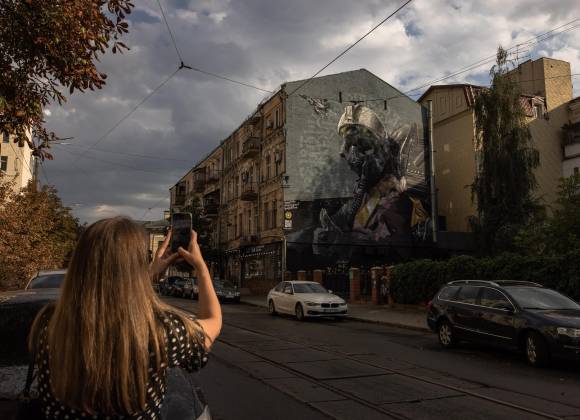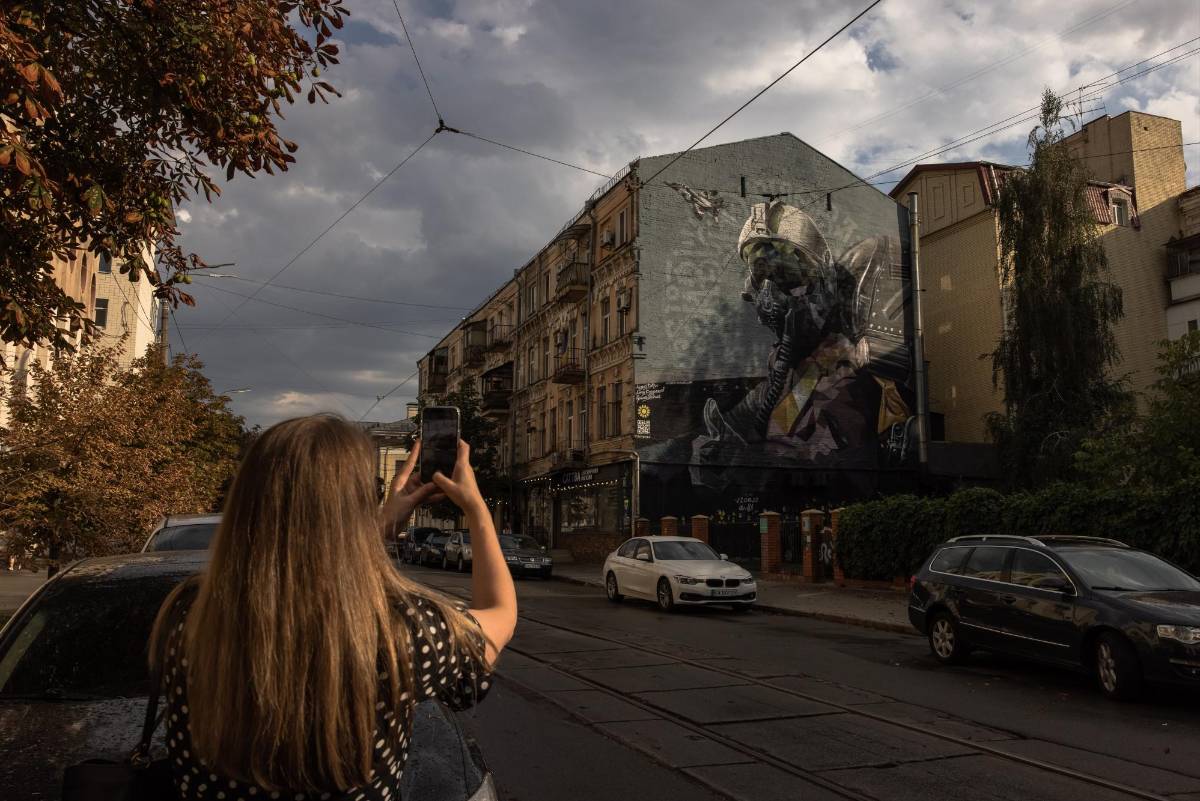 Un mural nombrado “El fantasma de Kyiv” rinde tributo a los pilotos ucranianos que defendieron la capital ucraniana de la invasión rusa al país.