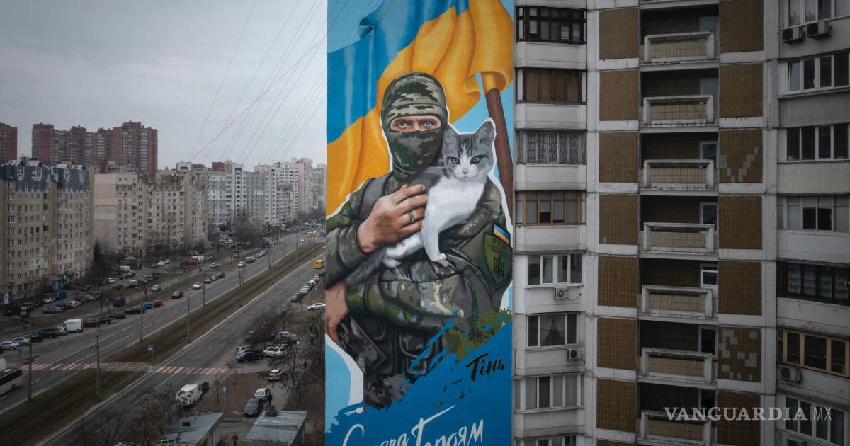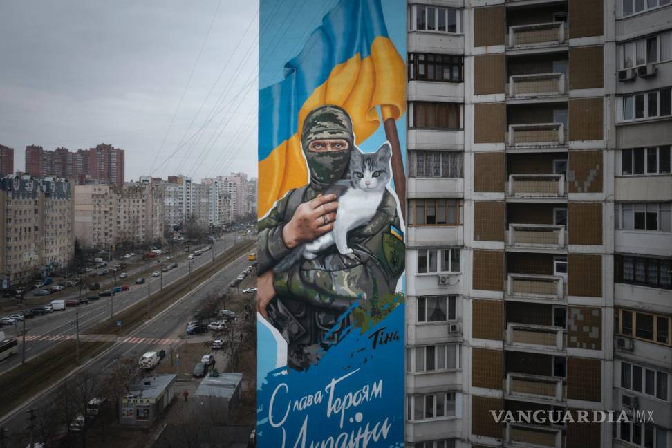 KIEV- Sobre el fondo azul y amarillo de la bandera de Ucrania, la enorme imagen de un combatiente enmascarado con un gato blanco y gris en sus manos se eleva sobre una calle desde el lateral de un edificio de apartamentos en Kiev.