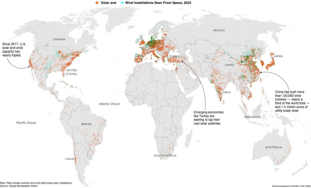 Los países están aumentando con gran rapidez su capacidad solar y eólica, que ahora es más barata y fiable que nunca. El mapa muestra las instalaciones en todo el mundo alrededor de 2024.