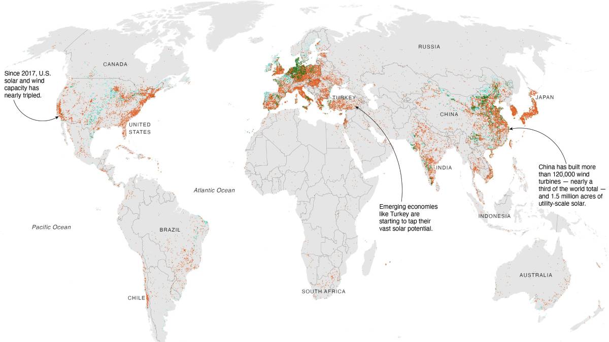 NUEVA YORK- Para darles seguimiento a estos cambios, los investigadores crearon Global Renewables Watch, organización dedicada a cartografiar los parques eólicos terrestres y los parques solares a gran escala del todo el mundo utilizando inteligencia artificial e imágenes de satélite detalladas para crear un “atlas viviente”.