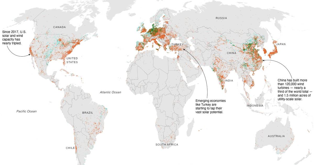Un nuevo análisis compartido con The New York Times muestra con cuánta rapidez países de todo el mundo están aumentando su capacidad solar y eólica, que ahora es más barata y fiable que nunca