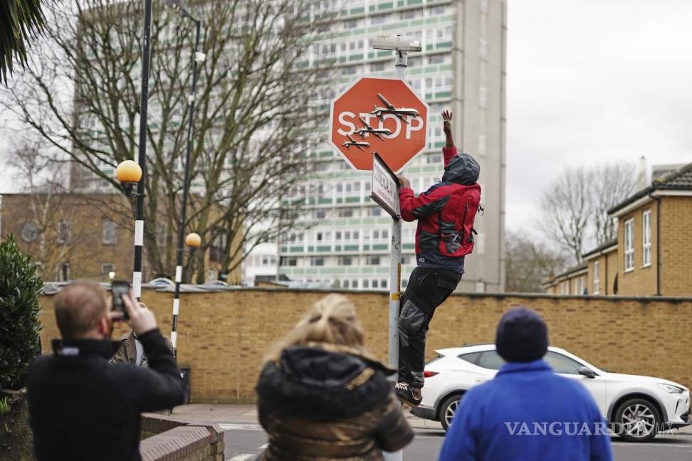 El video mostraba a un hombre con cizallas subido a una bicicleta para retirar la obra de un poste de señalización en una esquina de una calle de la zona de Peckham, en el sur de Londres, mientras otro hombre estabilizaba la bicicleta. El hombre que cortó la señal huyó con ella en la mano.