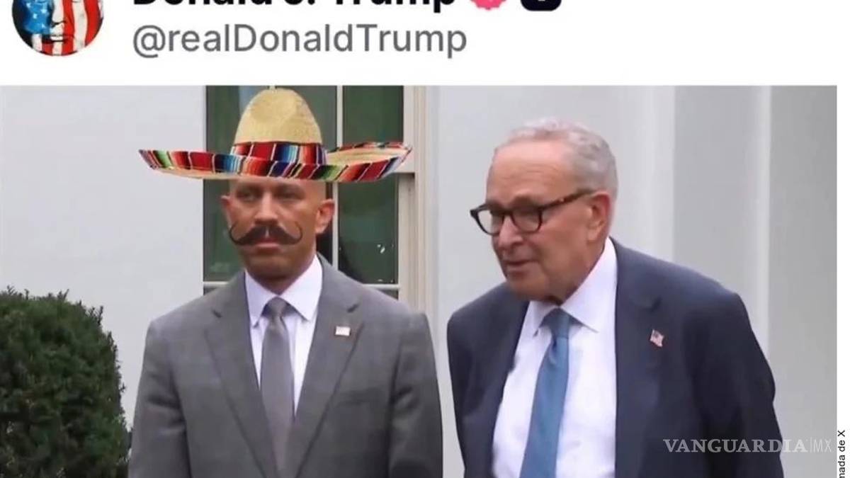 El Presidente de EU publicó en su cuenta de Truth Social un video con inteligencia artificial que muestra a Hakeem Jeffries, líder en la Cámara de Representantes, con sombrero mexicano y bigote.