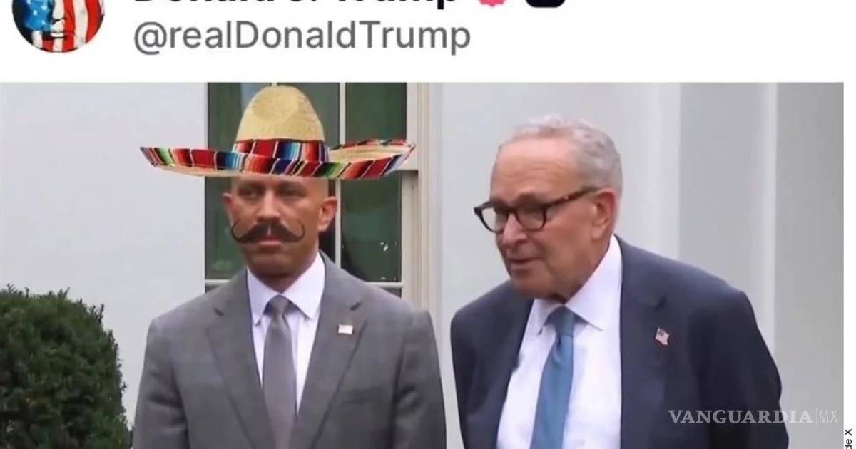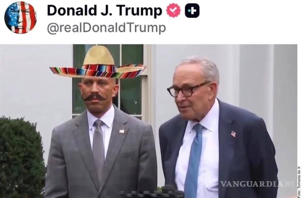 El Presidente de EU publicó en su cuenta de Truth Social un video con inteligencia artificial que muestra a Hakeem Jeffries, líder en la Cámara de Representantes, con sombrero mexicano y bigote