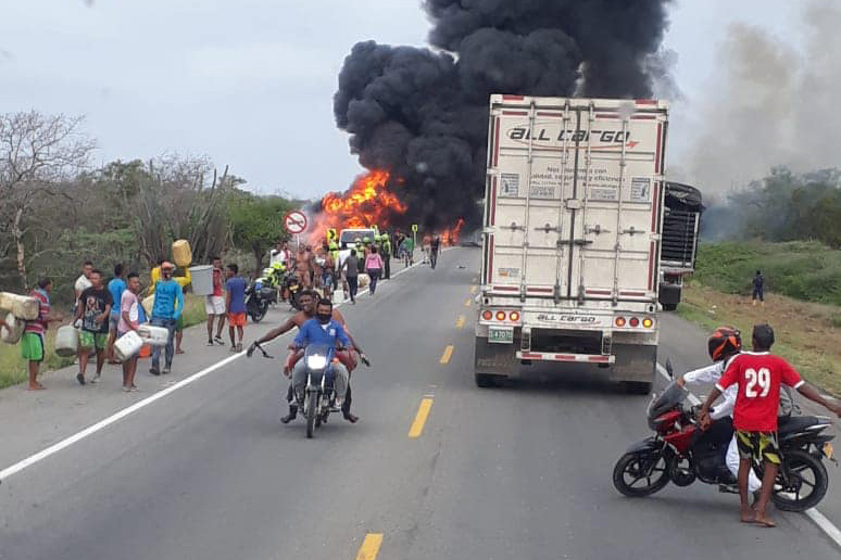 #Colombia | Un camión cisterna que transportaba combustible en la vía de Barranquilla a Ciénaga se volcó en en el sector la Tasajera. Habitantes de esa zona salieron a tratar de agarrar gasolina y el camión explotó.