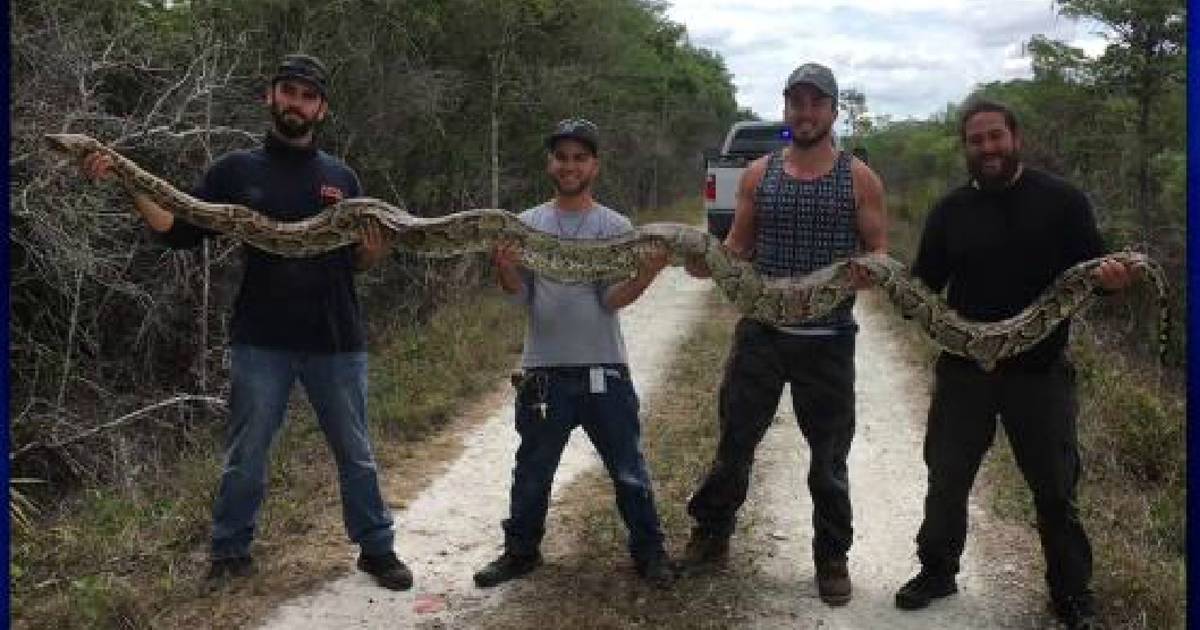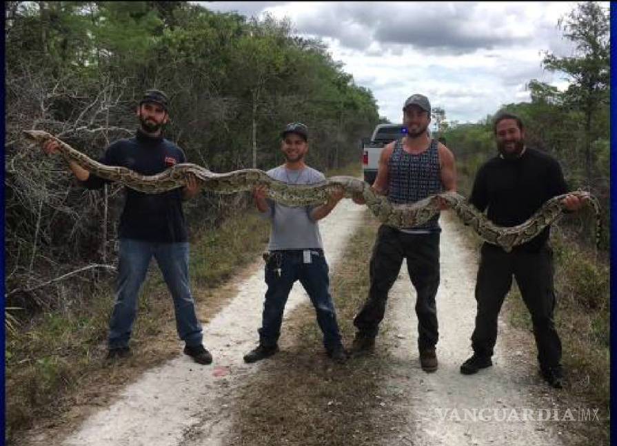 La pitón de 15 pies y 100 libras de peso (45 kilos) fue capturada ayer cerca de la reserva natural de Big Cypress Park y, en una foto divulgada por el canal local WSVN, se aprecia al ofidio mientras lo sostienen cuatro cazadores.