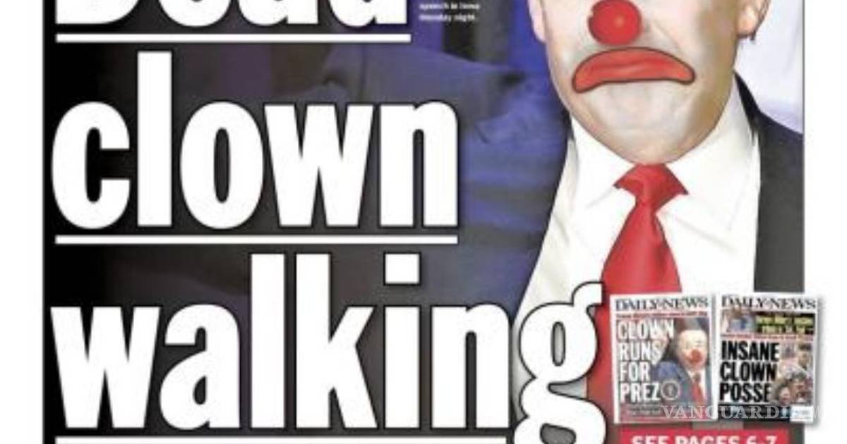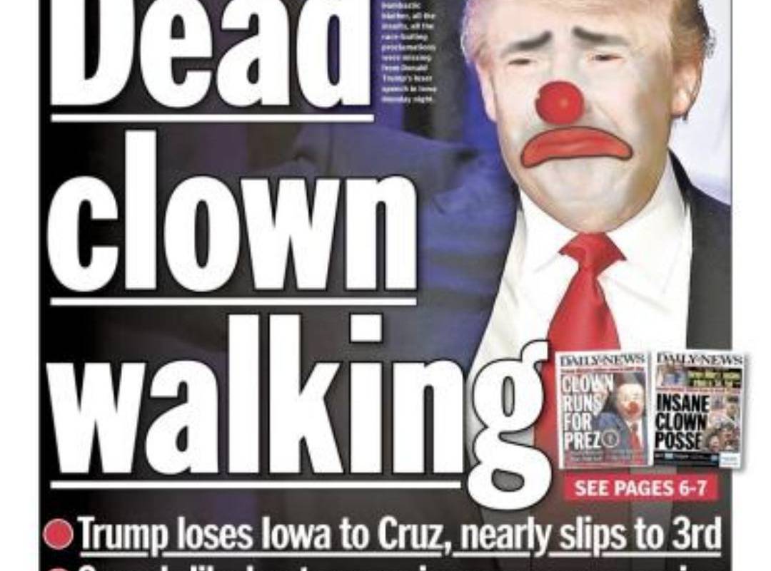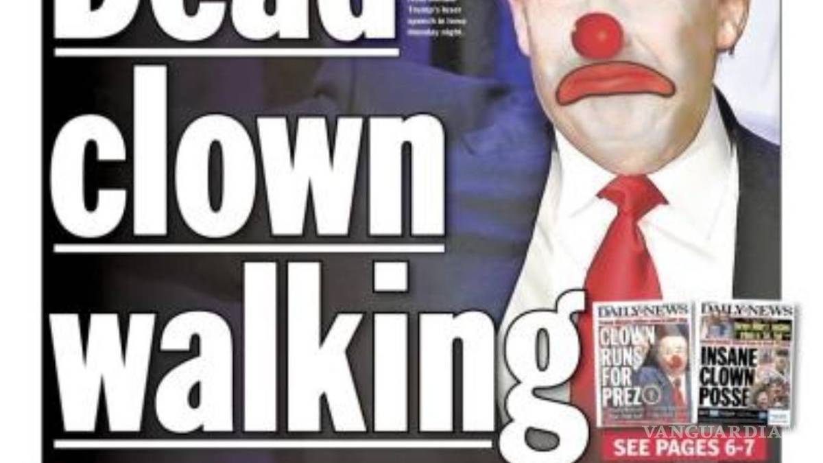 Con una portada en que se lee “Payaso muerto que camina” (dead clown walking), el tabloide mostró a un Trump cuyo rostro estaba alterado con maquillaje para hacerlo parecer un payaso triste, además de que subrayó que el magnate de bienes raíces estuvo por quedar en tercer sitio de la contienda.