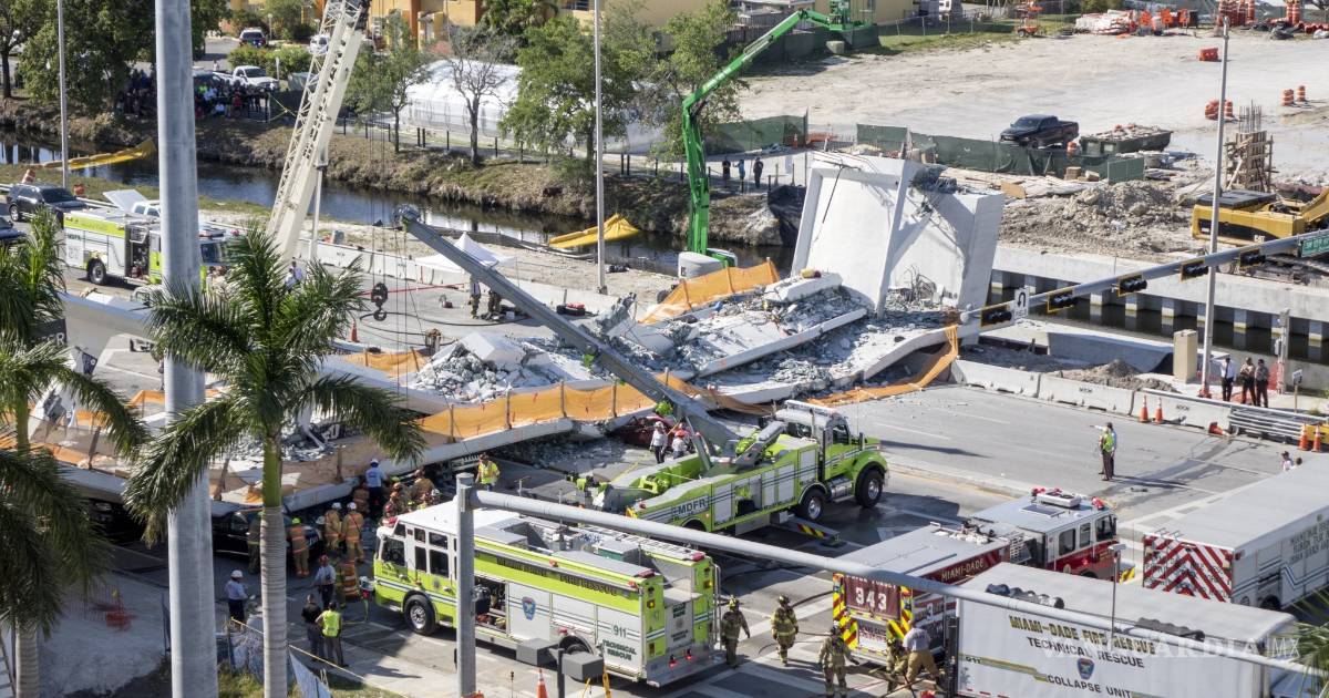 El puente que ayer se derrumbó había empezado a construirse en la primavera del año pasado y se previó su inauguración a principios de 2019; pesaba 970 toneladas y tenía 88 metros de largo y conectaba la Florida International University (FIU) con la ciudad Sweetwater, al oeste de Miami.