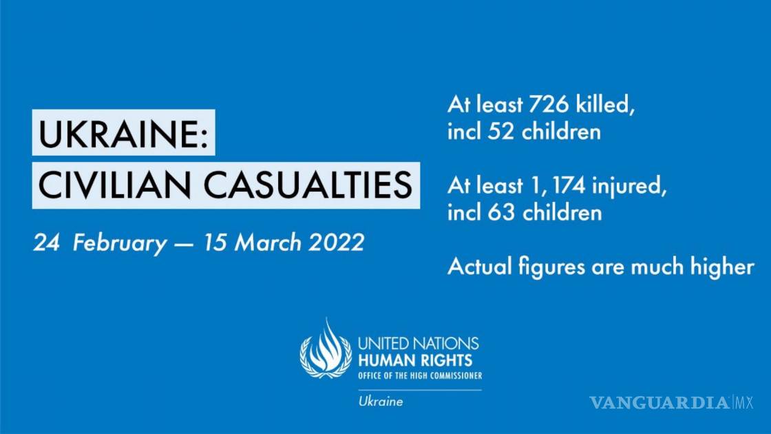 La Oficina de las Naciones Unidas para los Derechos Humanos dio a conocer que al menos 726 civiles han perdido la vida y 1,174 han resultado heridos en los 20 primeros días de guerra en Ucrania.